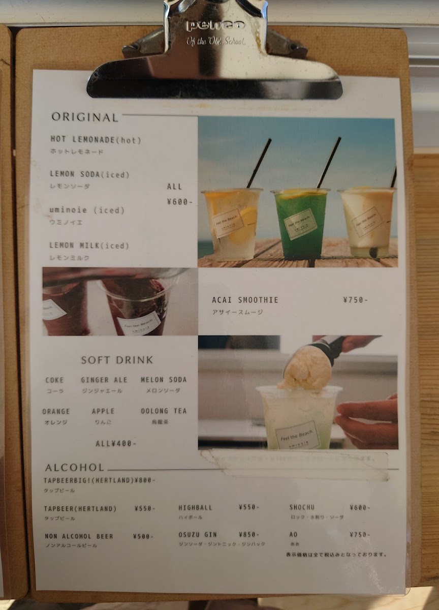 The café specializes in a delightful variety of beverages and bites, perfectly catering to beachgoers and coffee lovers alike. Start your culinary adventure with the チキン&チップス (Chicken & Chips) – a hearty serving of crispy fried chicken paired with fluffy fries for just JP¥1,100. It's a fulfilling meal that's not only delicious but also captures the essence of beachside indulgence.
